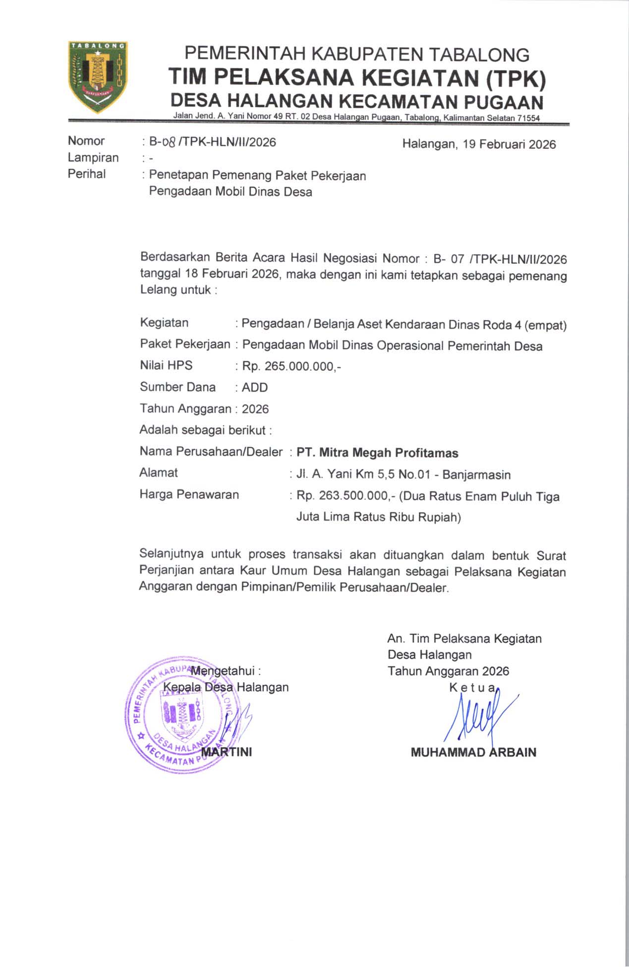 Sesuai dengan jadwal pelaksanaan kegiatan Lelang Sederhana Pengadaan Kendaraan Dinas Roda 4 (empat) di lingkup Pemerintah Desa Halangan Kecamatan Pugaan Kabupaten Tabalong. Bersama ini Tim Pelaksana Kegiatan (TPK) Desa Halangan mengumumkan pemenang paket kegiatan pengadaan mobil dinas desa berdasarkan berita acara hasil evaluasi penawaran Nomor: B-06/TPK-HLN/II/2026 tanggal 16 Februari 2026, sebagai berikut: